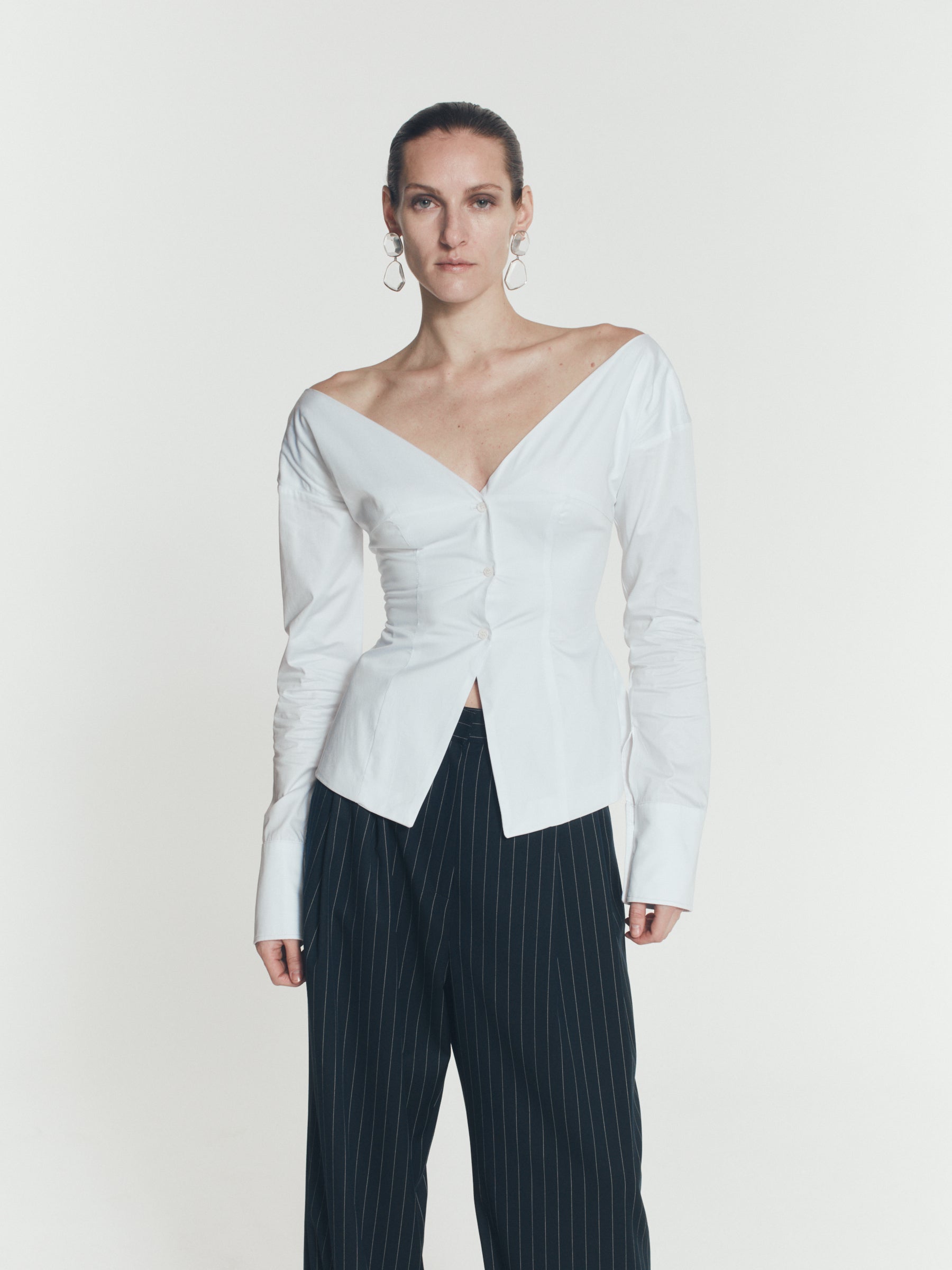 Pinstripe Boyfriend Pants, düșük bel (low rise), bol paça ve oversize kesimiyle klasik pinstripe pantolonu modern bir silüete taşır. Lacivert pinstripe dokusu ve önde yer alan çift pili detayı hacim kazandırır. Önden gizli kanca ve fermuar kapama ile tamamlanır. Oversize bir duruş için tasarlanmıştır. Düşük bel kullanmak için kendi bedeninizi tercih etmeniz önerilir.