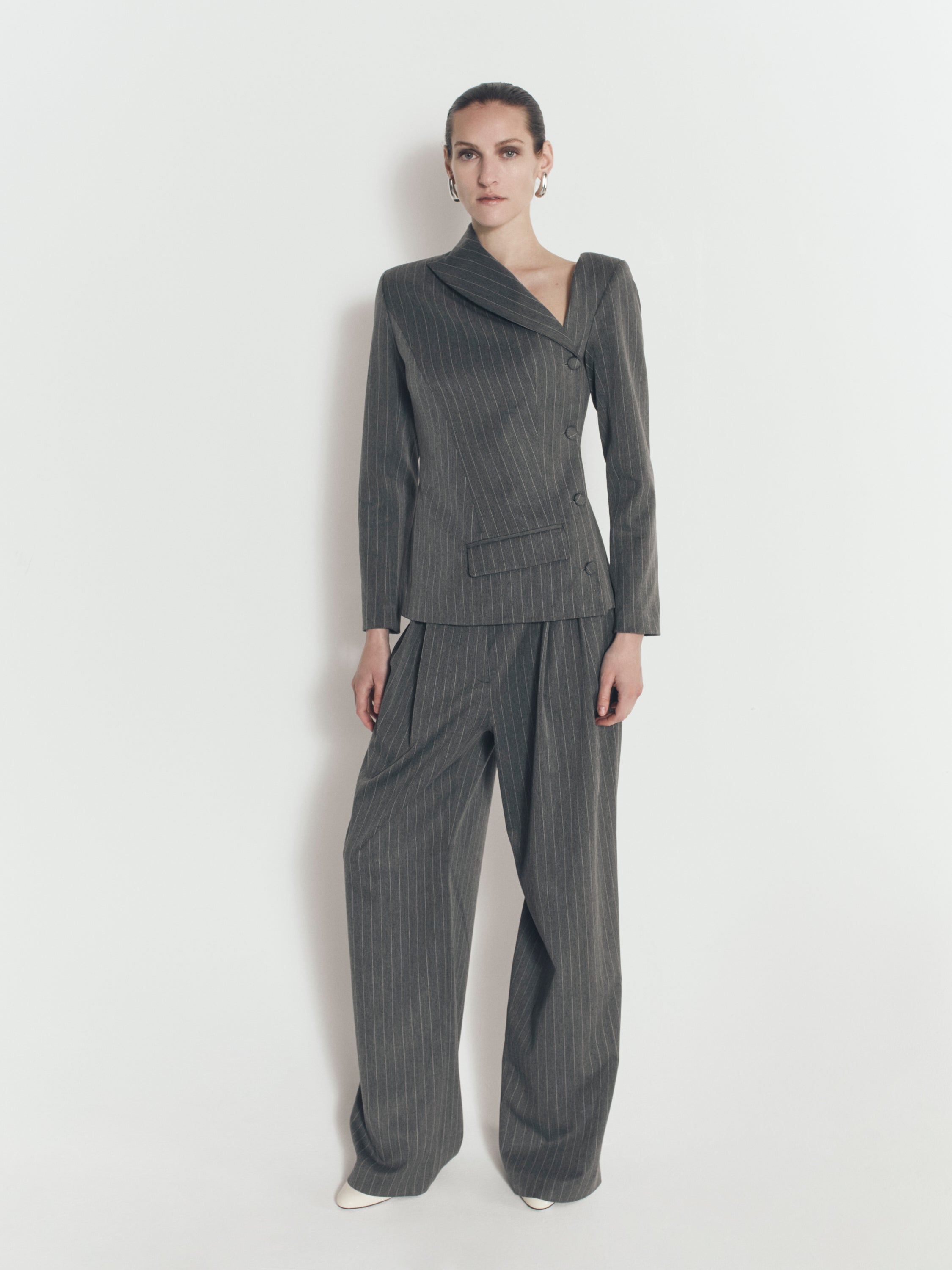 Pinstripe Boyfriend Pants in Grey, düşük bel (low rise), bol paça ve oversize kesimiyle klasik pinstripe pantolonu modern bir silüete taşır.Gri pinstripe dokusu ve önde yer alan çift pili detayı hacim kazandırır. Önden gizli kanca ve fermuar kapama ile tamamlanır. Aynı pinstripe dokusunu paylaşan Pinstripe Asymmetric Blazer ile birlikte uyumlu bir takım görünümü oluşturur. Oversize bir duruş için tasarlanmıştır. Düşük bel kullanmak için kendi bedeninizi tercih etmeniz önerilir.