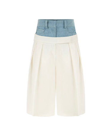 Double Waisted Bermuda Shorts in White, yüksek bel ve geniş paça kesimiyle güçlü bir duruş sunar. Çift bel tasarımı, denim görünümlü kemer detayıyla kontrast bir etki yaratırken, ön pileler tasarıma yumuşaklık katar.