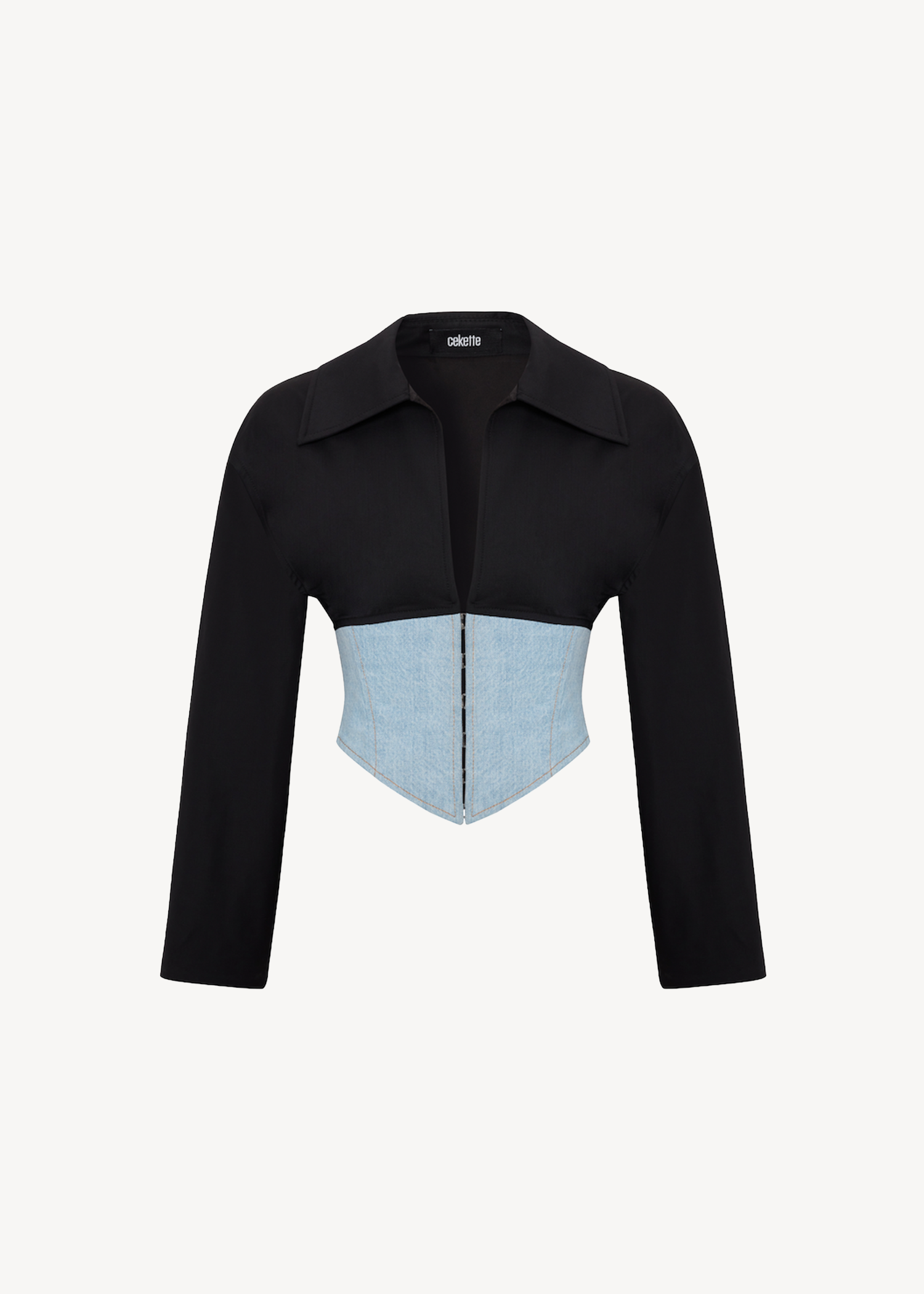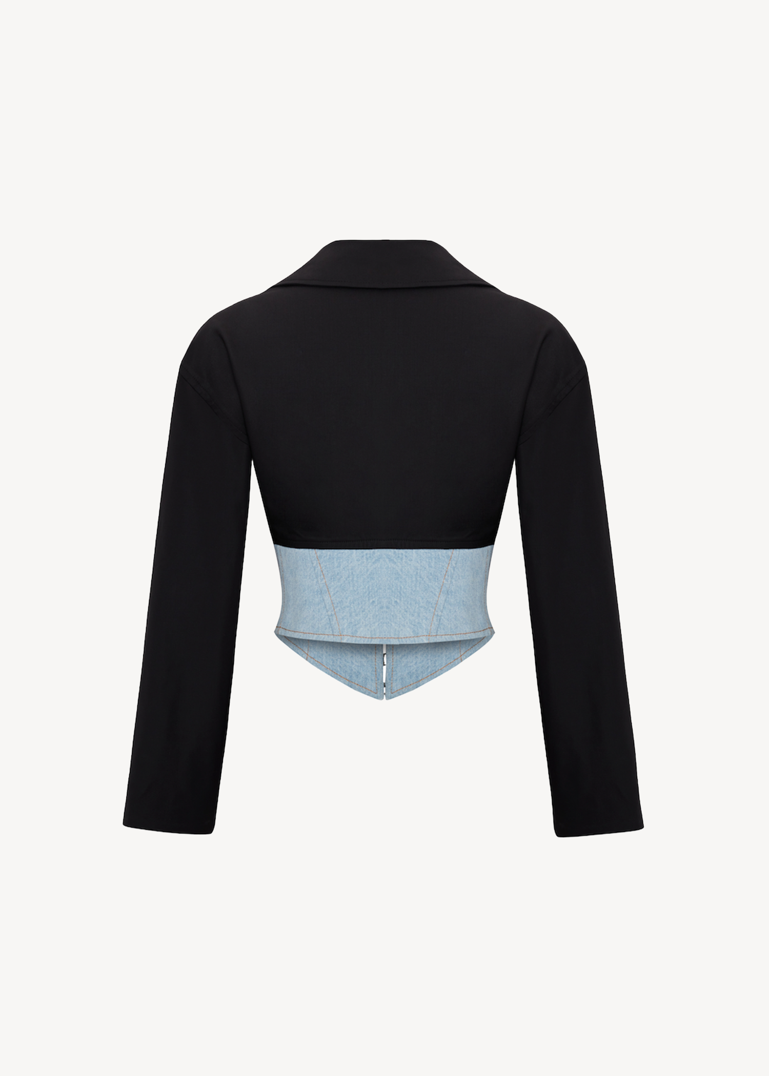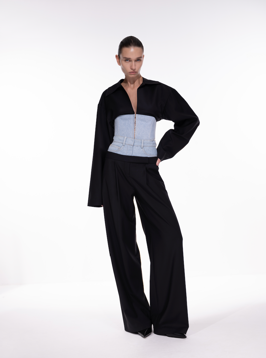 Nina Blazer in Black, kontrast denim korse ve wool blend blazer üst yüzeyiyle Nina formunu yeniden yorumlar. Önde kanca kapama ile tamamlanır. Kısa kesimi ve korse yapısı bel hattını açıkta bırakarak vurgular. Farklı kumaşların birlikteliği tasarıma belirgin bir kontrast kazandırır.