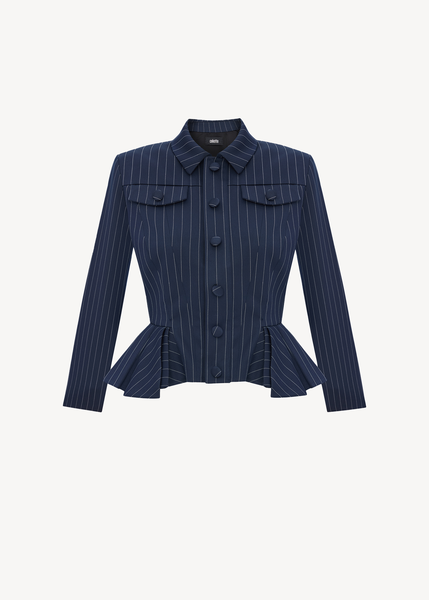 Pinstripe Peplum Jacket, lacivert ince çizgili kumaştan üretilmiş, slim-fit kesimiyle vücuda oturur. Fırfır peplum detayı bele oturarak silueti belirginleştirir. Klasik yaka ve saten astarlı yapısı tasarımın net duruşunu destekler. Önden düğme kapaması ve iki adet göğüs cebi ile tamamlanır.