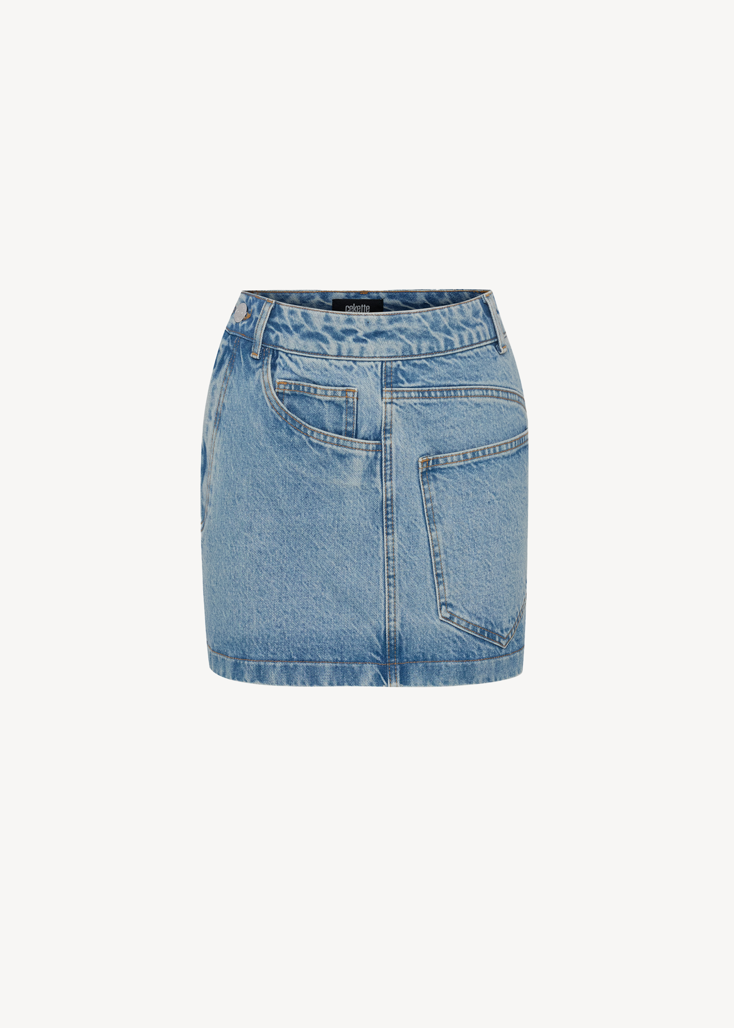 Side Chick mini etek, yan dönmüş görünü ile sıra dışı bir görünüm sunar. Açık mavi taş yıkama denimde esneme payı bulunmaz. Yandan fermuar ve logolu düğme kapama. Önde yer alan arka cebi işlevseldir.