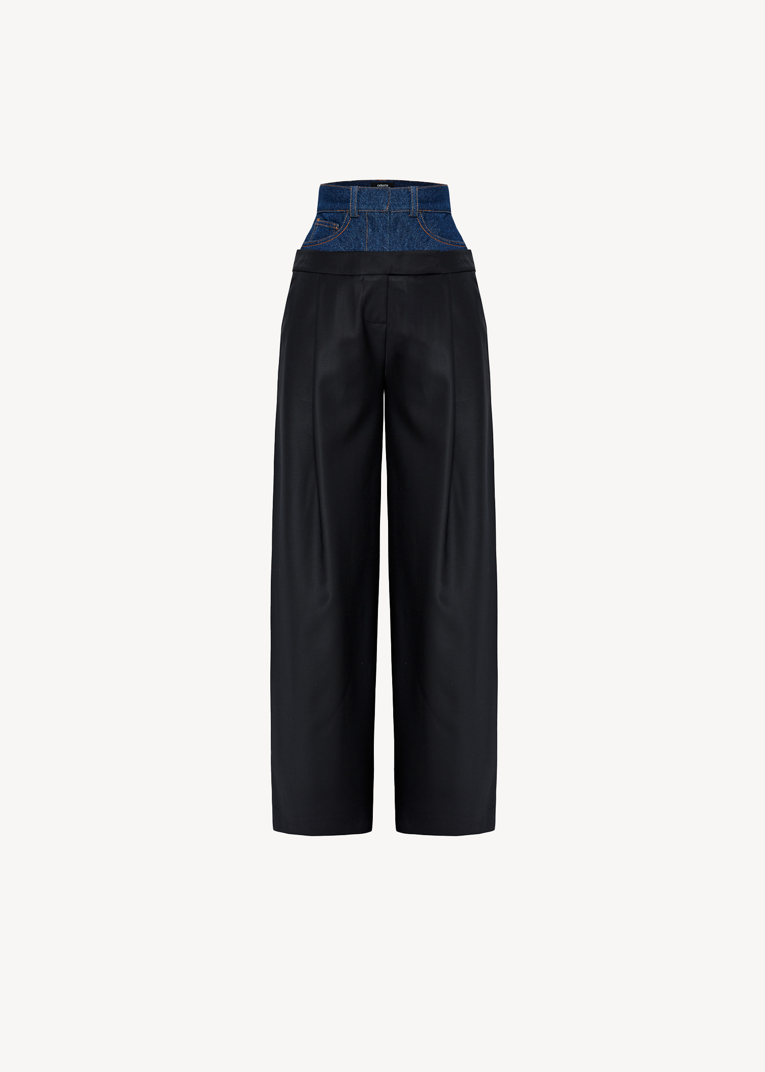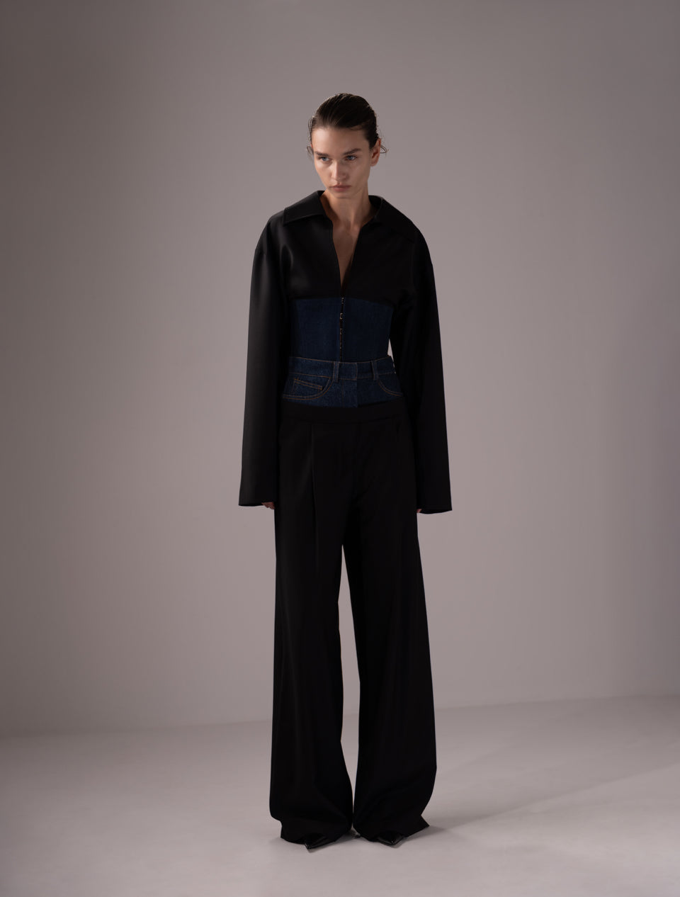The New Double Waisted Pants, açık mavi tonları ve denim detaylı çift bel tasarımıyla klasik tailoring’e çağdaş bir yaklaşım sunar. Yüksek bel ve düz paça kesimi net bir silüet oluştururken, gizli kanca ve fermuar kapama tasarımı sade tutar. Aynı ton ve kumaştaki Nina Blazer ile birlikte kombinlendiğinde tek parça etkisi yaratır.