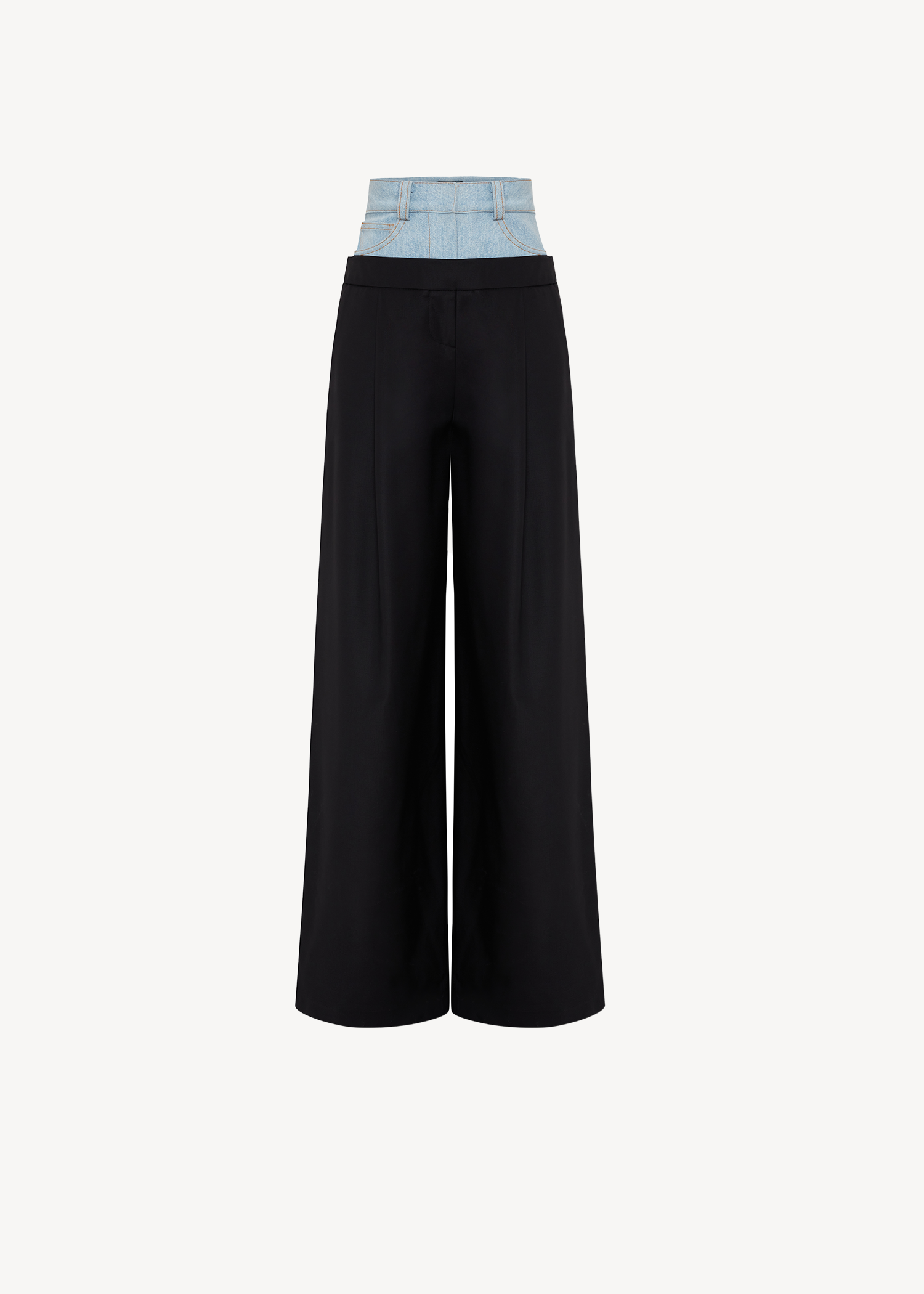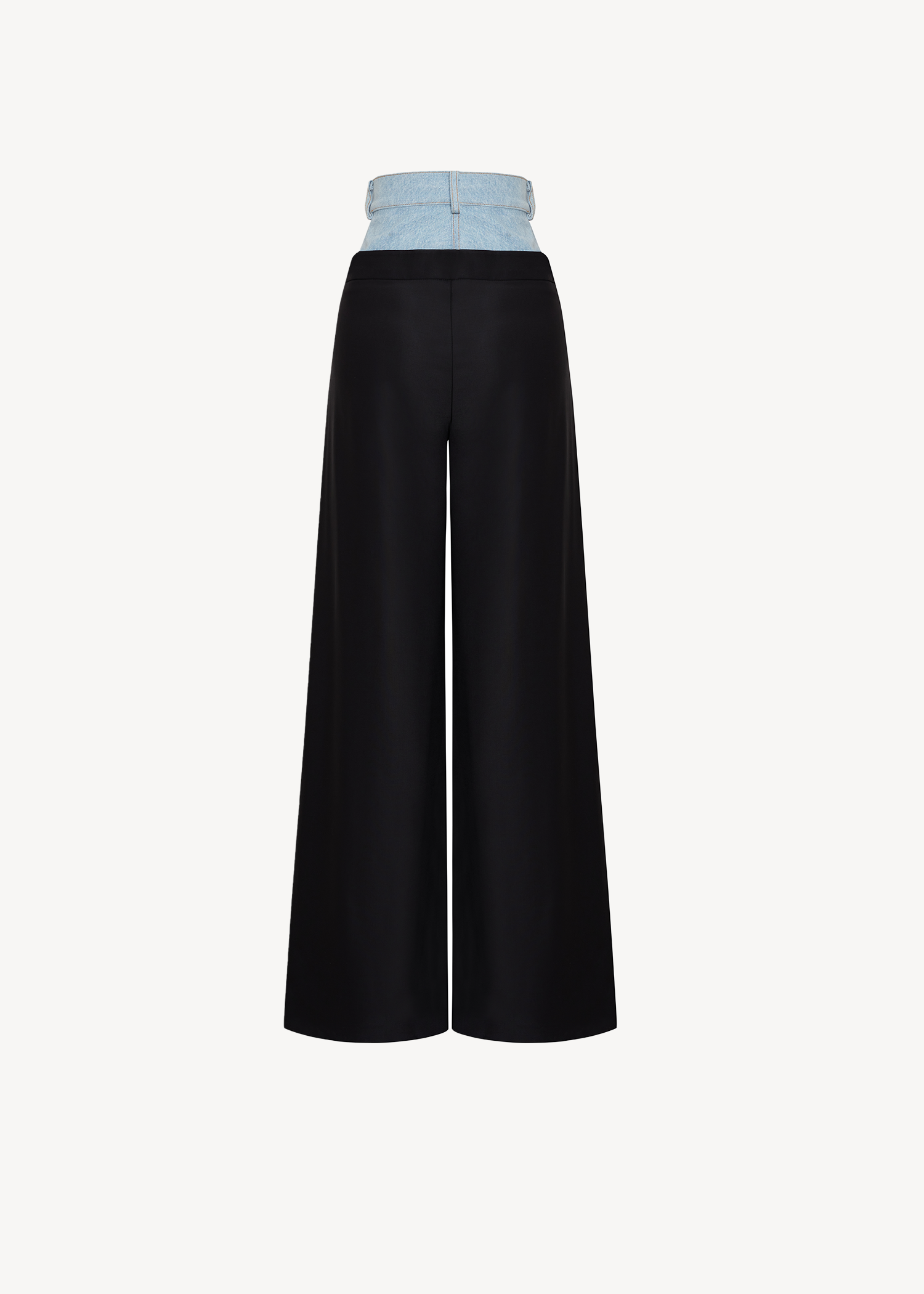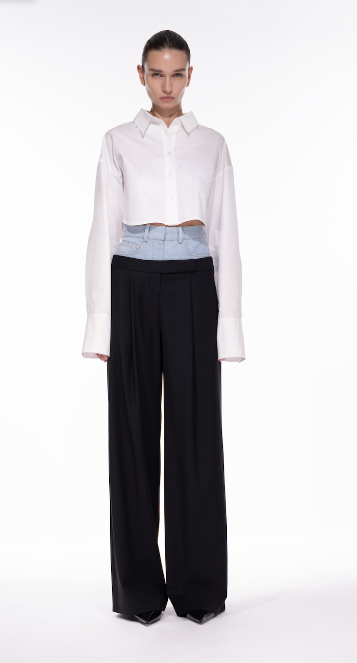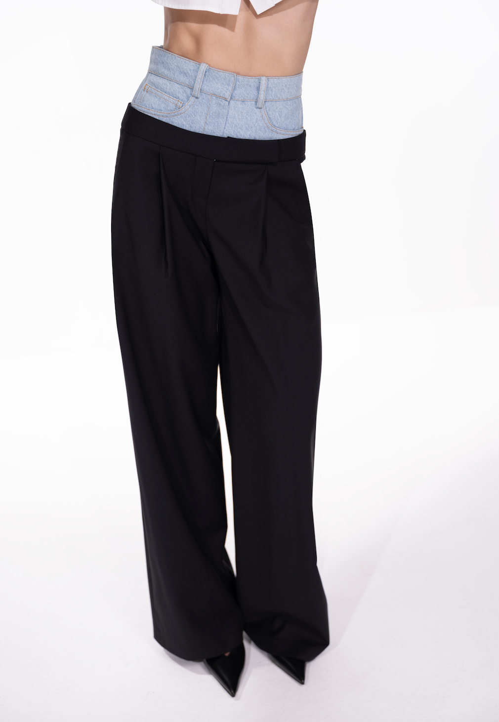 The New Double Waisted Pants, açık mavi tonları ve denim detaylı çift bel tasarımıyla klasik tailoring’e çağdaş bir yaklaşım sunar. Yüksek bel ve düz paça kesimi net bir silüet oluştururken, gizli kanca ve fermuar kapama tasarımı sade tutar. Aynı ton ve kumaştaki Nina Blazer ile birlikte kombinlendiğinde tek parça etkisi yaratır.
