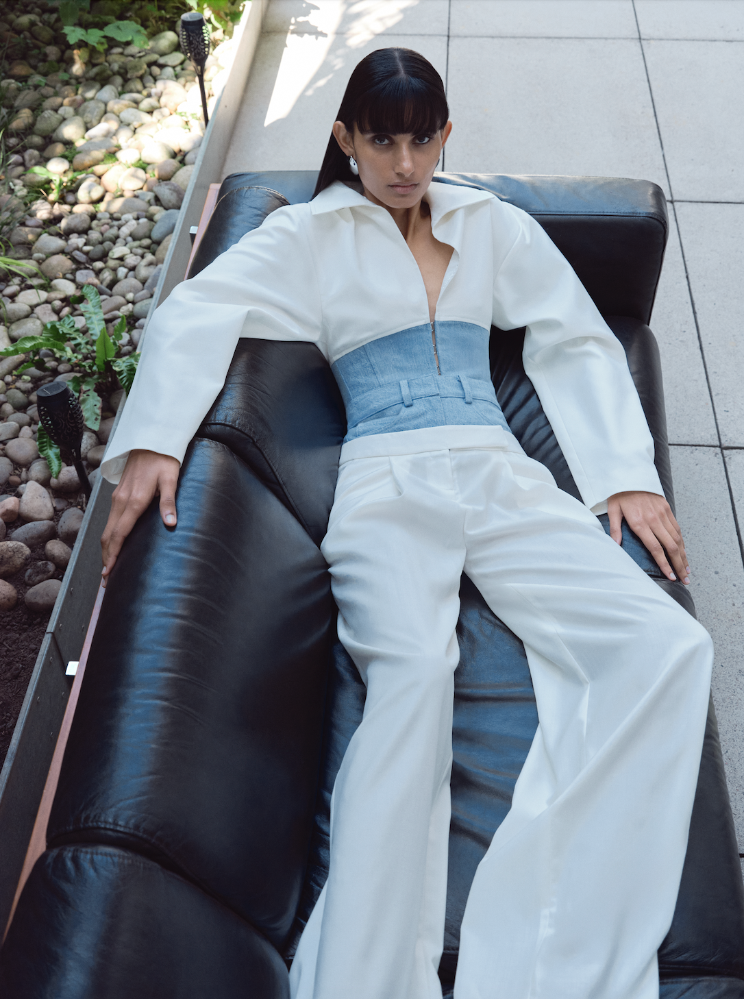 The New Double Waisted Pants, açık mavi tonları ve denim detaylı çift bel tasarımıyla klasik tailoring’e çağdaş bir yaklaşım sunar. Yüksek bel ve düz paça kesimi net bir silüet oluştururken, gizli kanca ve fermuar kapama tasarımı sade tutar. Aynı ton ve kumaştaki Nina Blazer ile birlikte kombinlendiğinde tek parça etkisi yaratır.